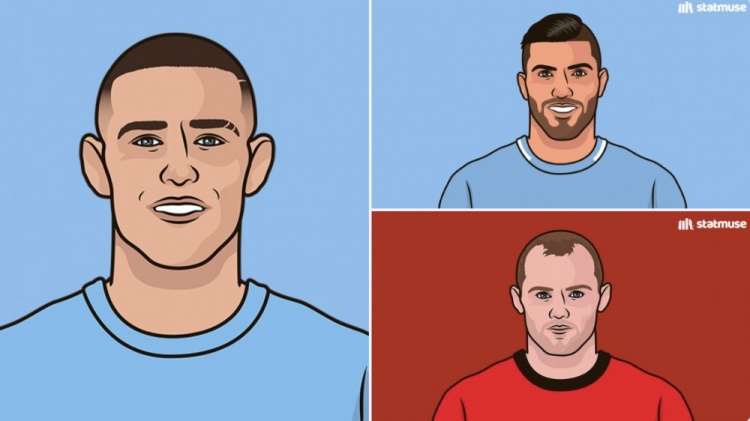 福登英超曼市德比打进7球,仅次于鲁尼的9球和阿圭罗的8球