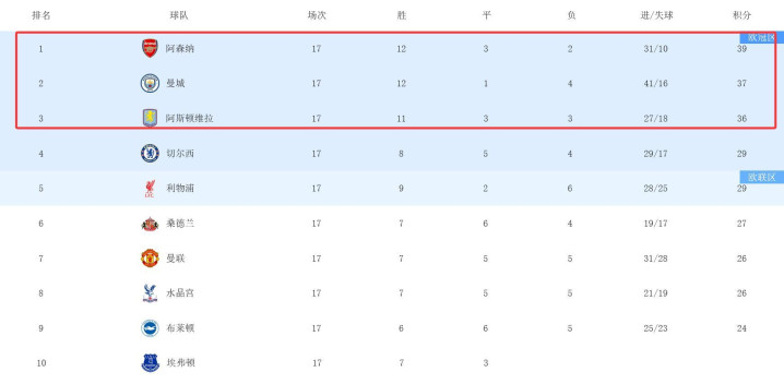 曼联队再次输球、维拉队再次赢球,在目前英超最新积分榜方面,基本上可以说是三支球队在第一集团:阿森纳队39分、曼城队37分、维拉队36分,相差都不大,阿森纳队不仅仅要面临曼城队的追赶,还有维拉的紧追不舍,从目前来看,枪手的优势不明显英超联赛免费观看,他们还真是不太稳。