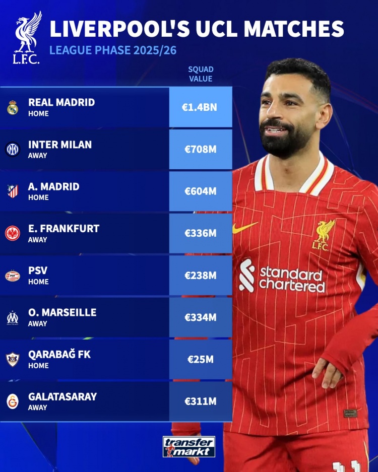 利物浦欧冠对手身价:皇马14亿欧最高,国米7.08亿&马竞6.04亿