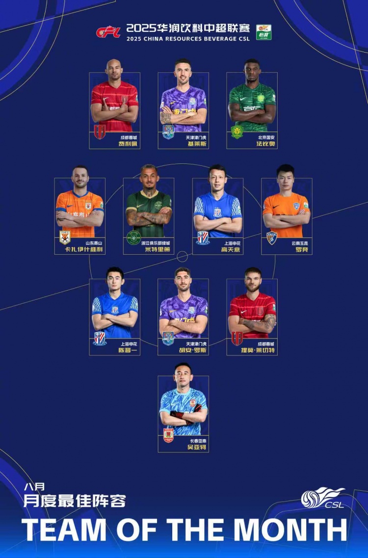 中超8月最佳阵形 :费利佩、瓦科在列,蓉城、申花、津门虎各2人