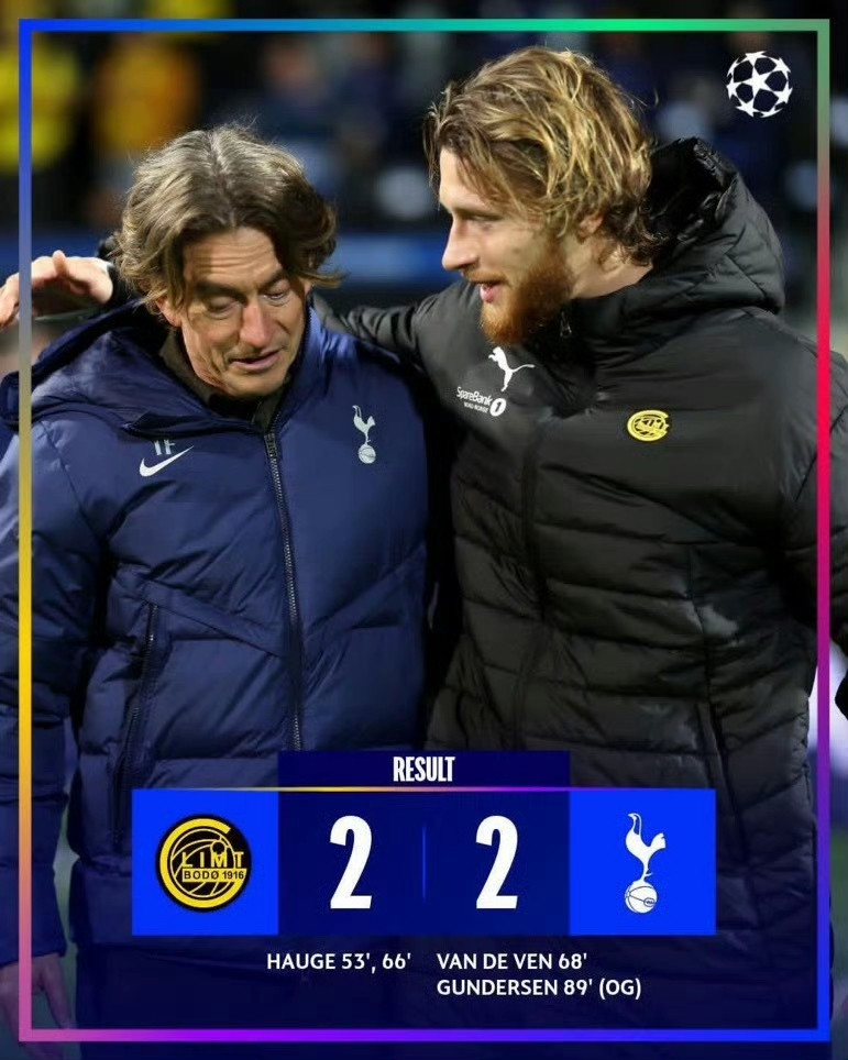 托特纳姆热刺则需要前往北极圈内迎战博德闪耀,即便错失了一次十二码球,博德闪耀还是率先打破僵局的一方,海于格的连进两球让博德闪耀无限接近欧冠首胜,只不过热刺在随后振作了起来,范德芬顶球破门后,热刺球员又制造了甘德森的乌龙,热刺艰难地从挪威带走一分。
