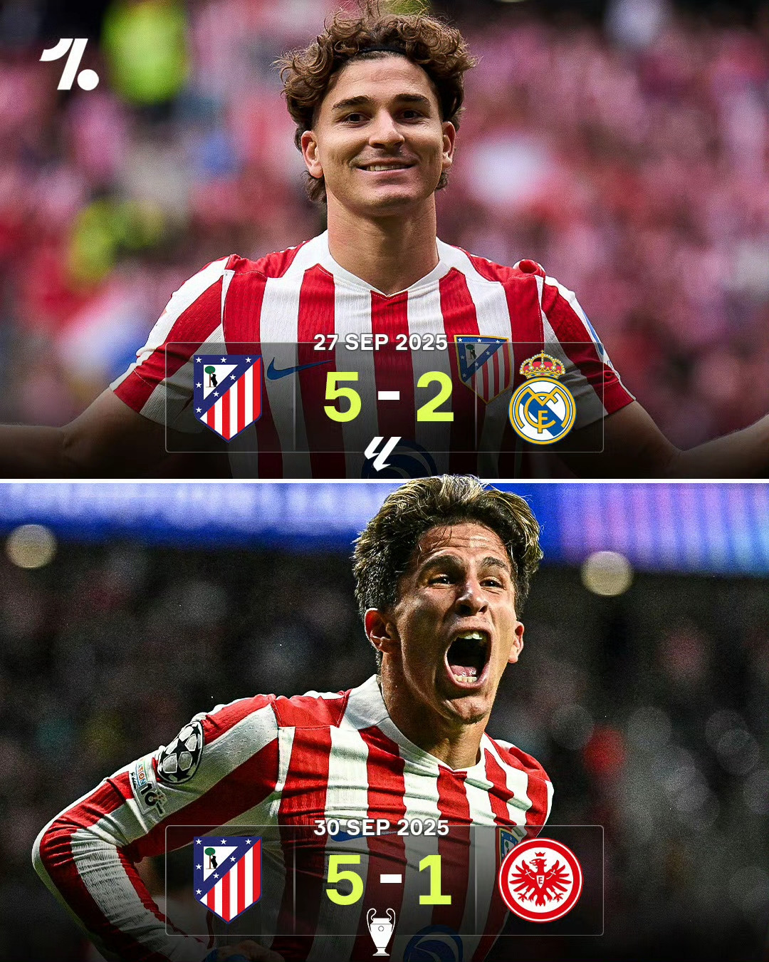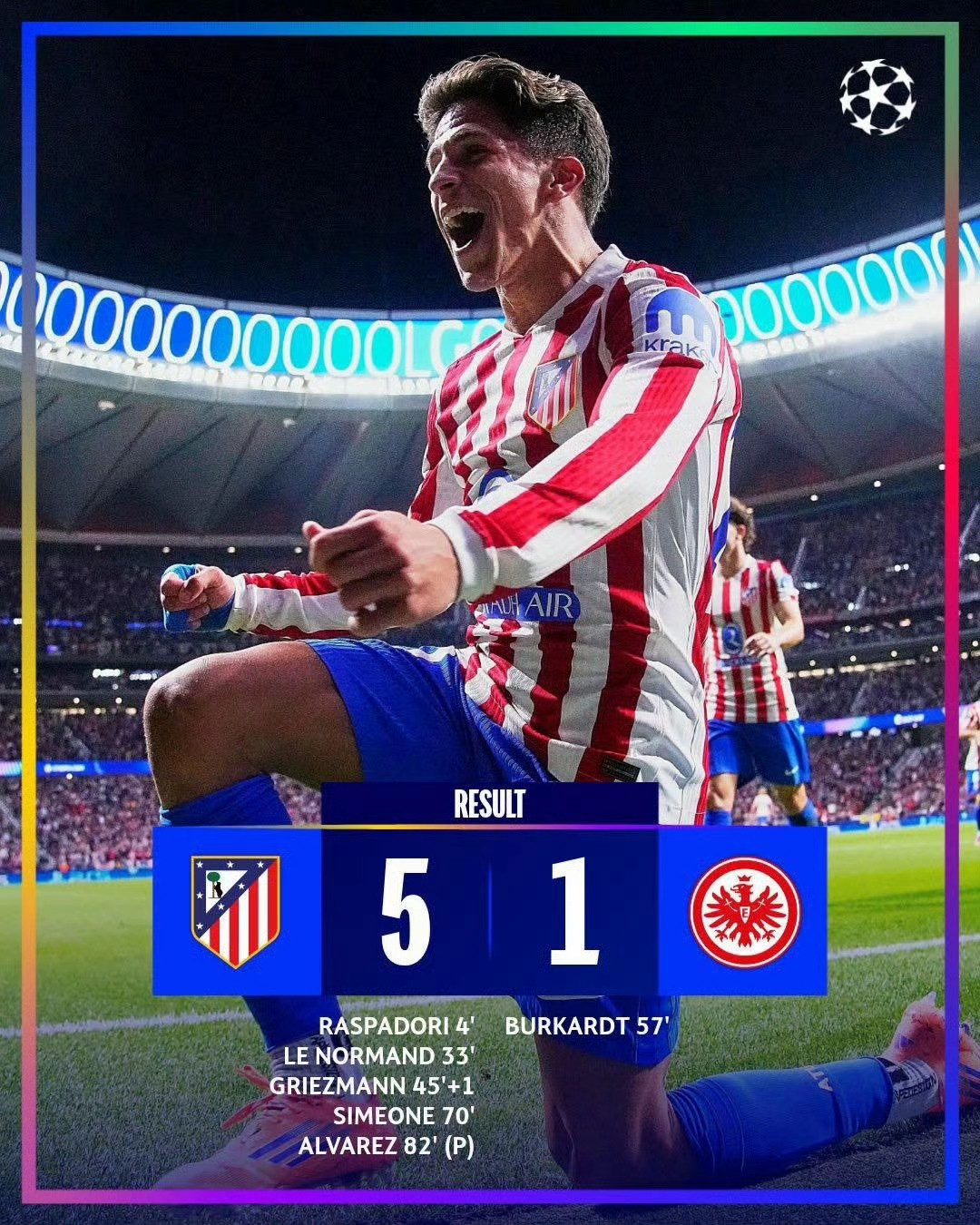 在首轮赛事 结束后,排名积分榜首的不是那些老牌豪门或是第一名 之师,而是德甲球队法兰克福,当然和首轮的对手相比,次轮他们需要前往西班牙应战 马德里竞赛 ,这并不是一个级别的对手。马德里竞赛 在上场赛事 中5-2击溃了皇家马德里,但欧冠首轮的失败 让他们需要在接下来的欧冠赛事 中争夺更多积分。开场后床单军团就拉满了强度,拉斯帕多里在第4分钟就取得了得分 ,此后虽然法兰克福占据了盘带优势,但获得更多机会的明显还是马竞。第33分钟,勒诺尔芒打进了自己的欧冠首球,而上半场结束前格列兹曼打进了自己在马竞的第200粒得分 ,赛事 悬念在上半场就终结了。下半场赛事 中马竞主动收缩,法兰克福凭借伯卡特的得分 扳回一城,但此后马竞凭借小西蒙尼和阿尔瓦雷斯的得分 继续扩大领跑 ,最终法兰克福在首轮5-1赢球的情况下次轮输了个1-5,而马竞在近2场赛事 中打进了10球。
