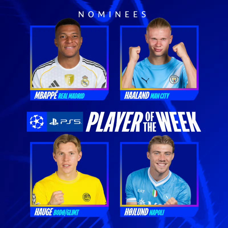 姆巴佩凭借出色发挥当选欧冠官方评选出的本轮赛事 最佳球员,其他候选人包括哈兰德、海于格以及霍伊伦。