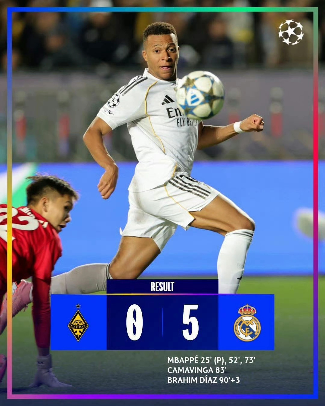 在本轮欧冠,皇马5-0大胜阿拉木图凯拉特,姆巴佩上演独中三元。