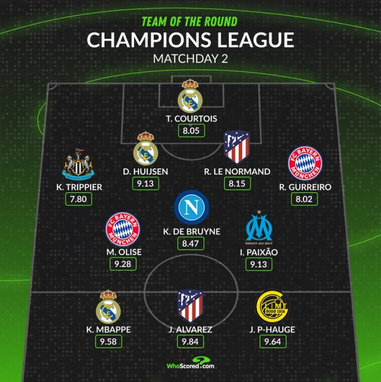 ②欧冠官方本轮最佳球员:10-姆巴佩(皇家马德里)