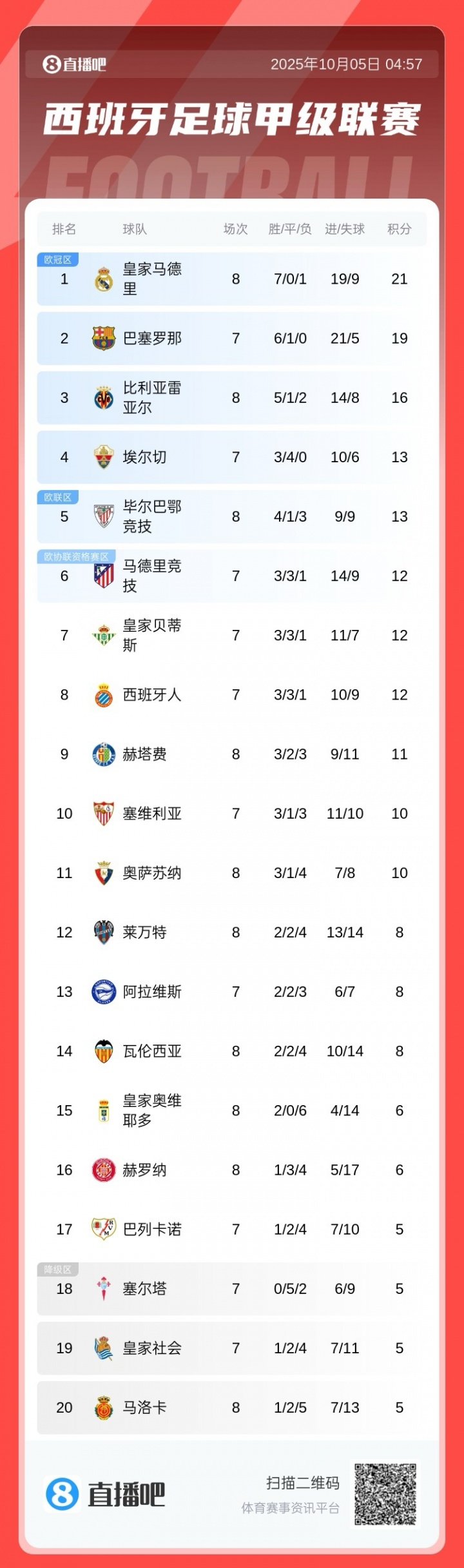 西甲积分榜:皇马先赛暂2分优势登顶,巴萨今晚客战塞维