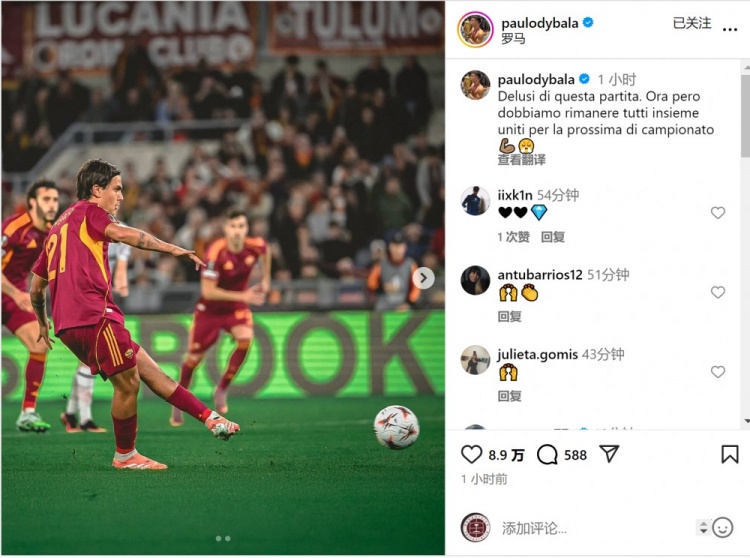 欧联杯失败 !迪巴拉:对赛事 感到失望,此刻要团结一致准备比赛 下一场