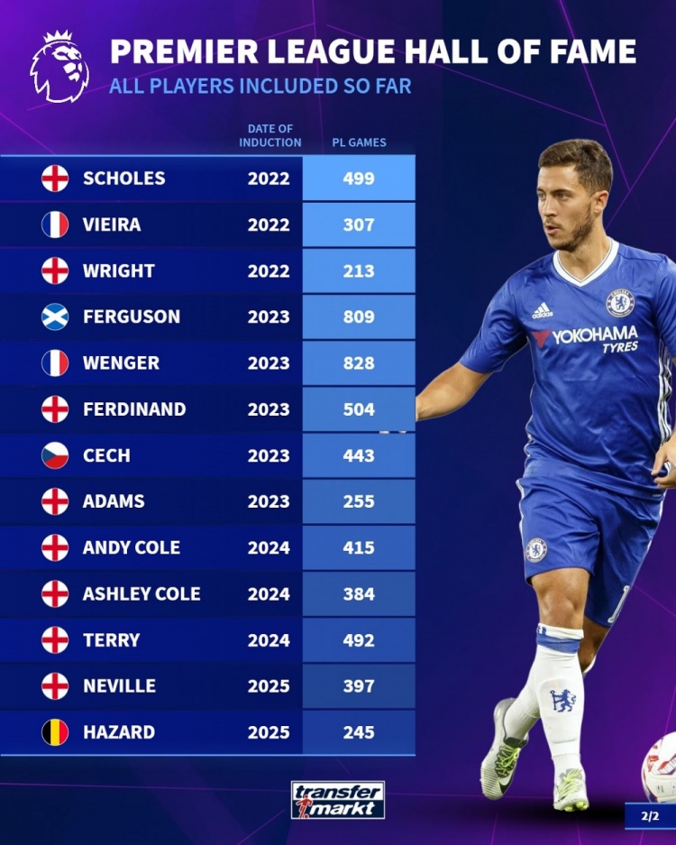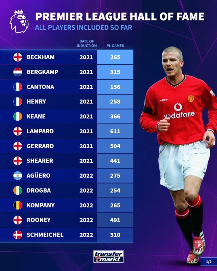 11月4日讯 德转盘点了英超职业联赛 名人堂成员的英超赛事 加入 次数,具体如下: