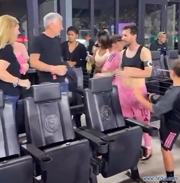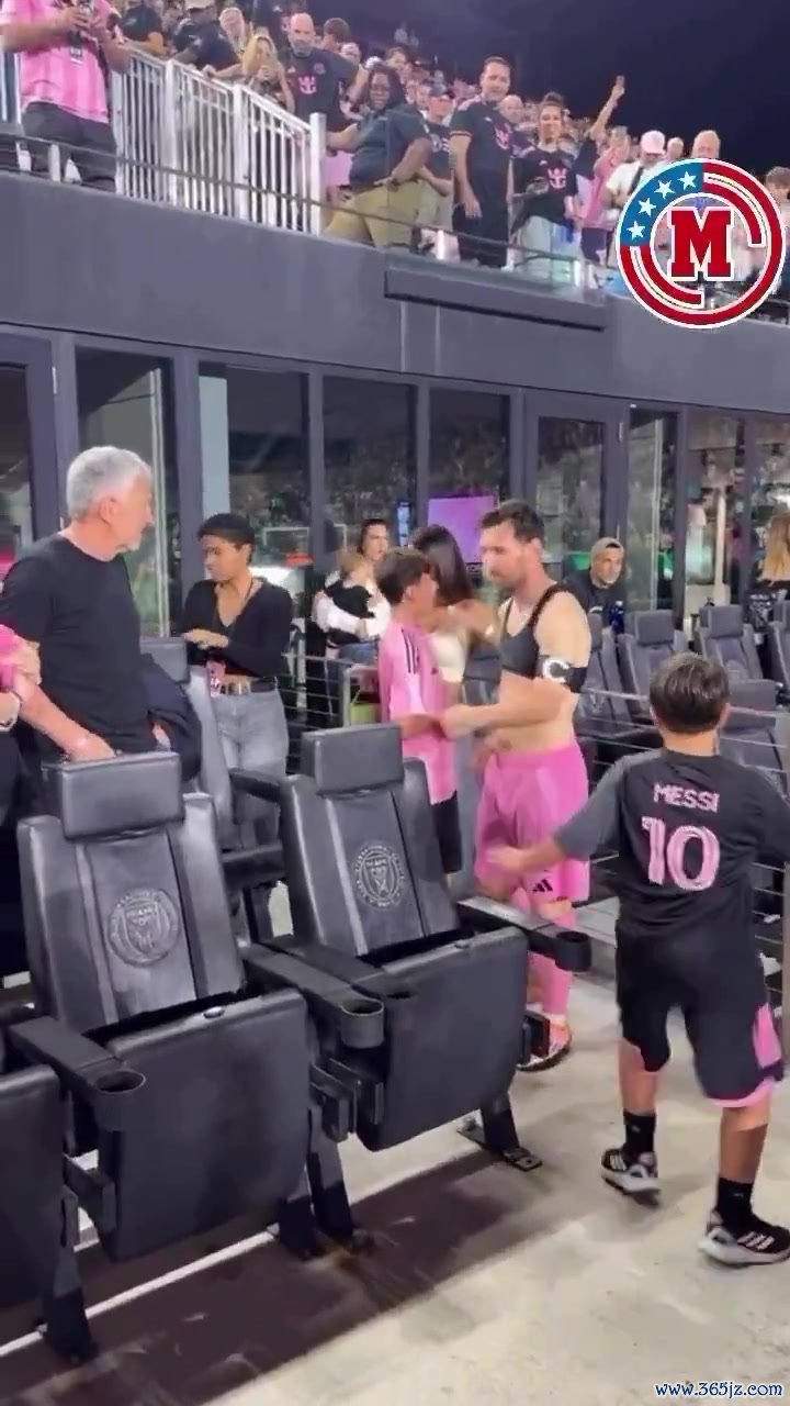 赛后在场边梅西与家人聊着,梅西的儿子马特奥酝酿后一脚踢向梅西。