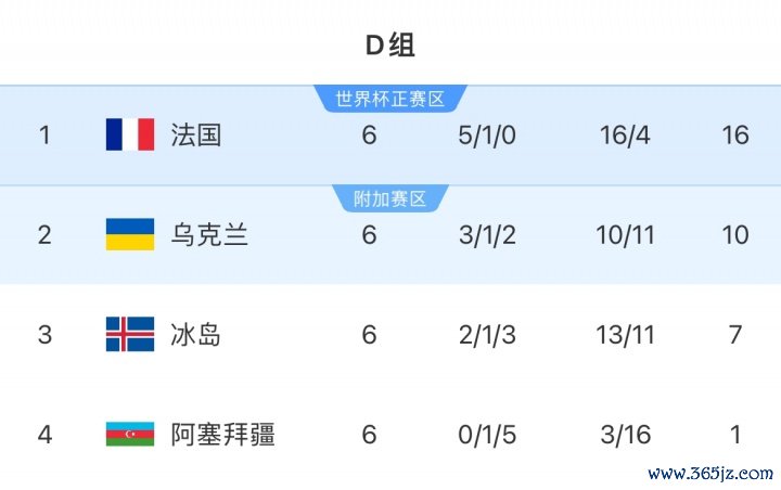 世欧预D组积分榜:法国6轮不败6分居首,乌克兰末轮胜冰岛锁定第2